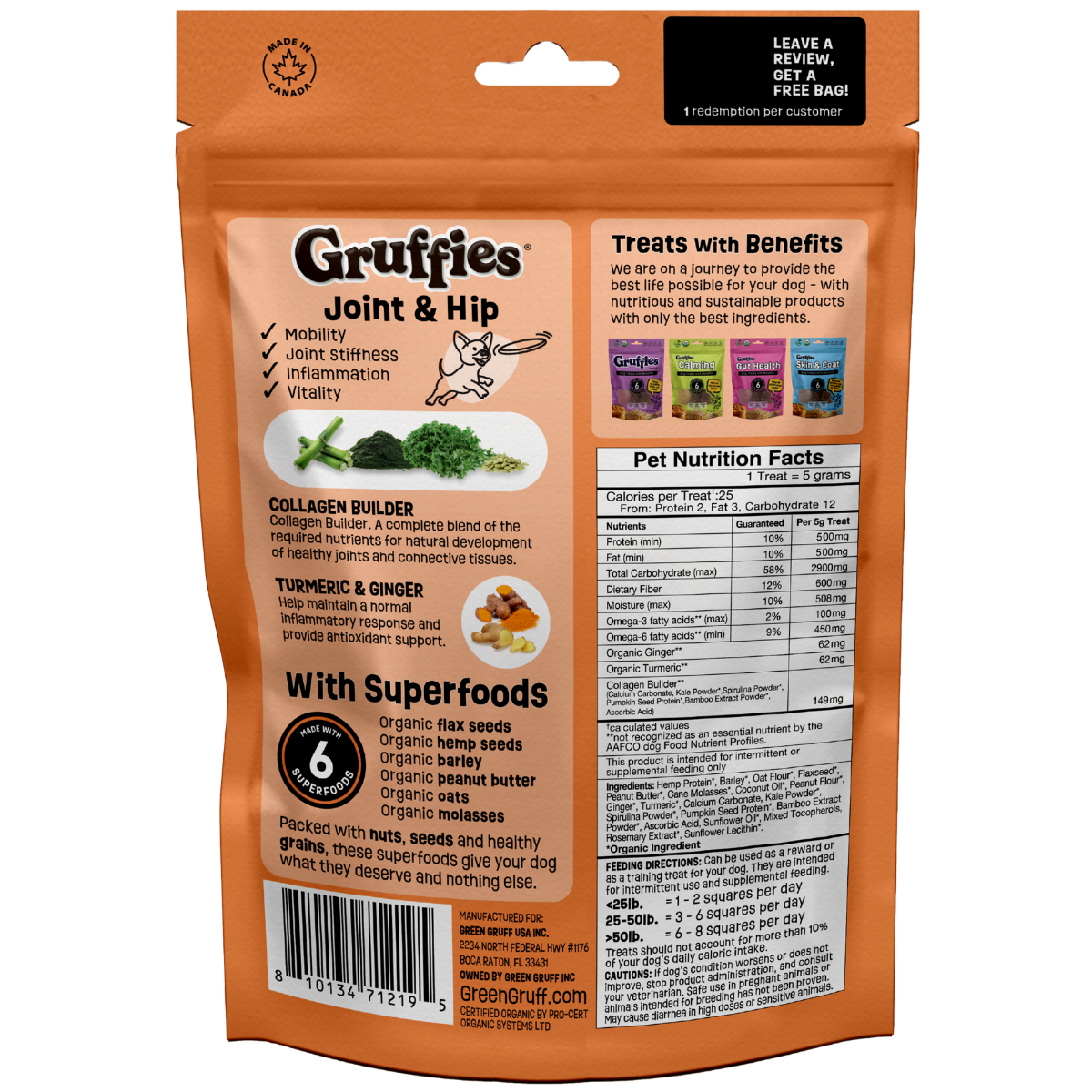 Gruffies treats promote better digestion, joint support, calmed behavior, and a shinier coat thanks to the blend of protein-rich hemp hearts, omega-packed flax, and other nutritious superfoods with the addition of formulation specific active ingredients.