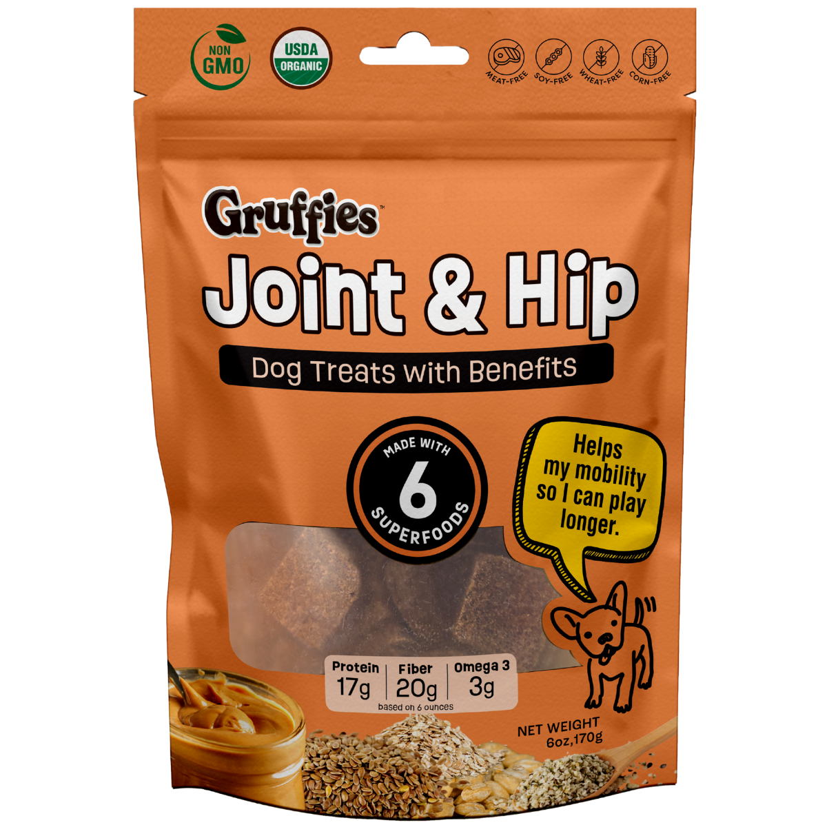 All dogs love treats, but they all have different needs and require specific benefits. More than just delicious peanut butter treats – Gruffies are USDA Certified Organic made with nuts, seeds, & healthy ingredients formulated to support your dog’s unique goals to live their best life possible.